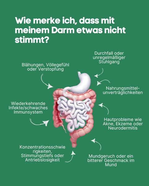 Typische Anzeichen dafür, dass etwas mit deinem Verdauungssystem nicht im Lot ist, können wiederkehrende Blähungen, Durchfall oder Verstopfung, Unverträglichkeiten gegenüber bestimmten Lebensmitteln oder ein allgemeines Unwohlsein im Bauchbereich sein. Auch Müdigkeit, Stimmungsschwankungen oder Hautveränderungen können auf ein Ungleichgewicht im Darmmikrobiom hinweisen – diese Hinweise sind nicht eindeutig und sollten ärztlich abgeklärt werden. (Siehe „Wie merke ich, dass mit meinem Darm etwas nicht stimmt?“ auf dieser Seite.)